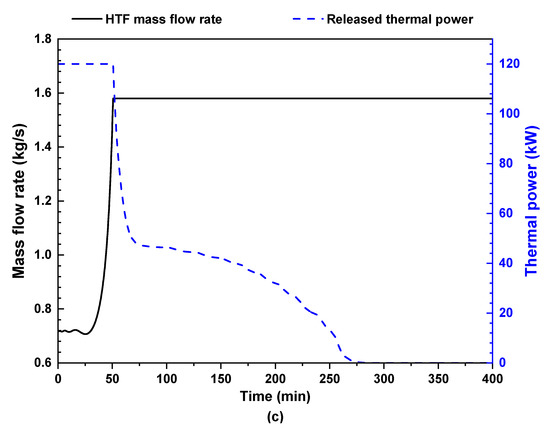 (a) Time-wise evolution of the HTF temperature, (b) the PCM temperature and liquid fraction in the tank and (c) the HTF mass flow rate and the released thermal power.
