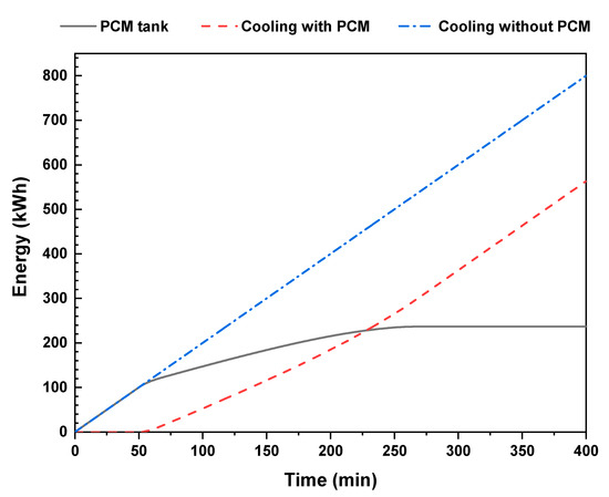 The advantage of using the PCM tank in the proposed solar-powered cooling system is shown in Figure 18. This figure illustrates the variation of the released thermal energy from the PCM tank and the chiller energy consumption with and without using the PCM tank. The cumulated released thermal energy from the tank increases from the beginning of the discharging process until the end of the operation where it becomes constant and is equal to 240 kWh (end of the discharging). Through analyzing the cooling system with the PCM tank, it can be seen that the chiller energy consumption is equal to zero during the first hour as the PCM tank is able to provide all the necessary thermal power for the cooling process. This result is advantageous compared to the use of sensible storage systems such as water or oil and as proposed by the literature [24,25]. With the progress of the discharging process, the chiller auxiliary heater is turned on as the produced thermal power from the PCM tank is lower than 120 kW (See Figure 17c). Through the comparison of the energy consumption of the two systems (with and without the PCM tank), it can be concluded that using the PCM tank provides a stable operation of the cooling system and reduces its energy consumption by up to 30%.