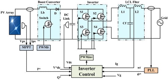 For PV systems to operate effectively, it is necessary to control various parameters, such as the PV side for maximum power extraction, the inverter side for injecting high-quality current, and the grid side for any additional tasks. The ambient temperature and solar irradiance must be considered during a PV system’s design and planning phases. These factors greatly influence the PV system’s output power [34,35]. Figure 1 shows the schematic diagram of a system comprising a dual stage with a PV system connected to the PCC through a DC-DC boost converter, grid inverter, and control system as proposed in the literature [7,22]. The system may operate in both grid-connected and islanded modes.