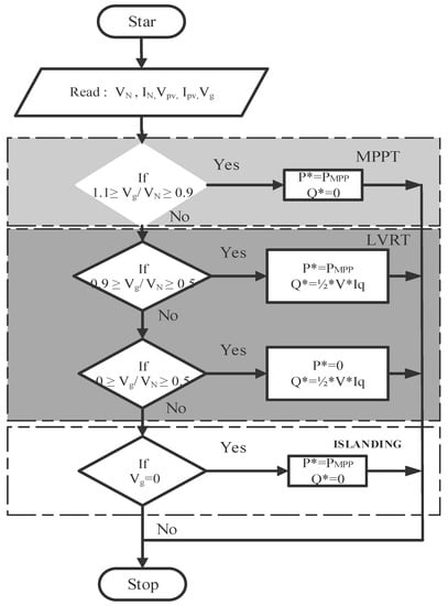 This section discusses the control scheme of a single-stage single-phase grid-connected PV system. In normal cases, the PV solar system would be operated in MPPT mode, which may give maximum power to the grid. However, when a fault occurs at the PCC, the grid will require the PV inverter to supply a reactive current to boost it [7]. During islanding, this mode will switch to fault mode, as illustrated by the flowchart diagram in Figure 3.
