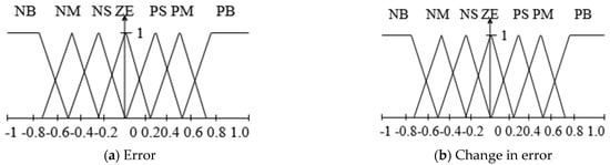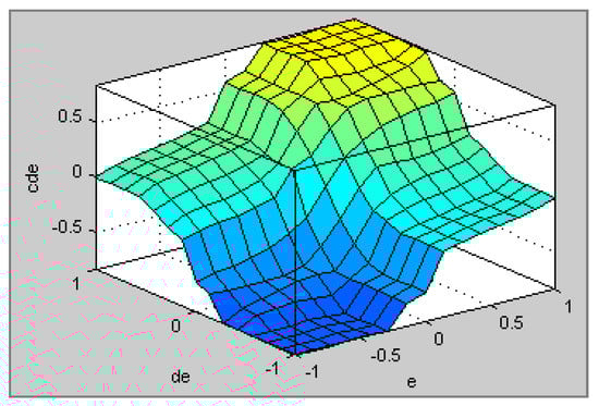 ANFIS belongs to the class of neuro-fuzzy systems, which combine the learning capability and the parallel computation of neural networks with fuzzy systems. Neuro-fuzzy systems can be trained to develop fuzzy rules and determine the membership functions for the variables of the system. The structure of a neuro-fuzzy system is similar to that of a multi-layer neural network and includes an input and an output layer, along with three hidden layers that represent the membership functions and fuzzy rules. ANFIS training uses a hybrid learning algorithm combining the least-squares estimator (forward pass) and the gradient descent method (backward pass) [37]. These features provide ANFIS with superior performance and robustness [38]. In this section, an ANFIS-based controller is proposed for the control of the inverter DC-link voltage. Details of the design steps and a list of the parameters of the ANFIS training are given in Appendix A. Figure 5 depicts the triangular membership functions of the error, , and error change, . Figure 6 illustrates the variations of the output against the two inputs and . ANFIS was originally designed with bell-shaped MFs.