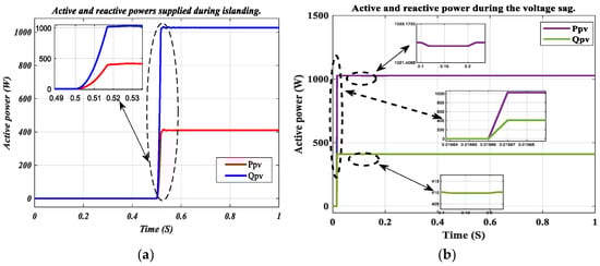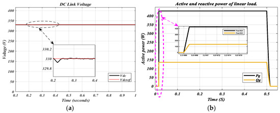 Figure 9a,b shows the various forms of power during islanding and sag voltage. Moreover, the DC link voltage and real and reactive powers’ waveforms for a linear load are depicted in Figure 10a,b, respectively. These results show the good performance of the proposed control system.