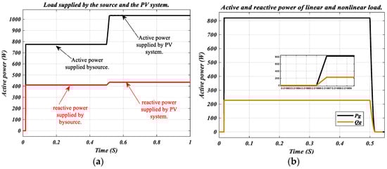 Simulation results: (a) load supplied by the source and PV; (b) real and reactive power for linear and nonlinear loads.