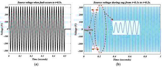 Simulation results: (a) source voltage under faults; (b) source voltage during sag.