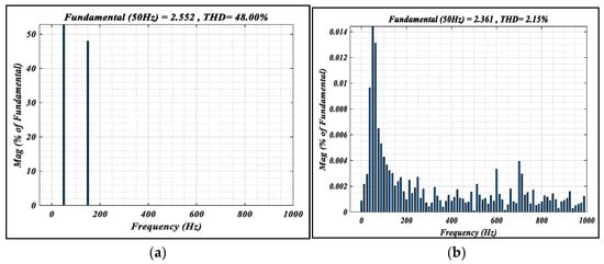 Grid current THD analysis. (a) THD before active filtering; (b) THD after active filtering.