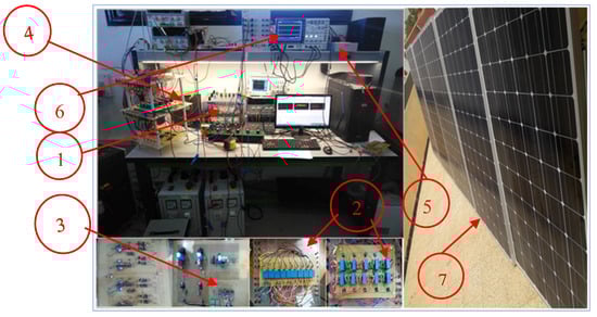 The experimental setup designed to validate the proposed control strategy for the grid-connected PV system is shown in Figure 14. It consists of: