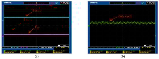 Experimental results of (a) the PV voltage and output voltage of a boost converter, and (b) the duty cycle.