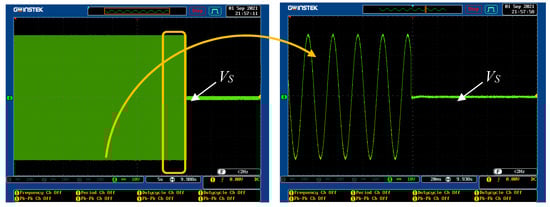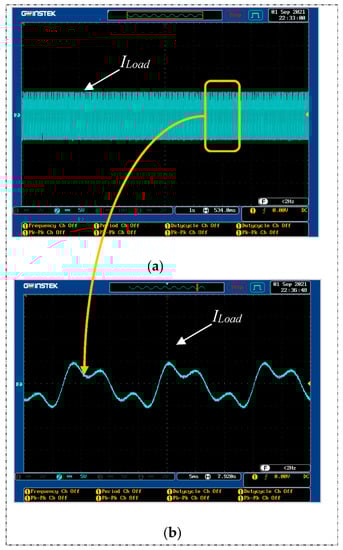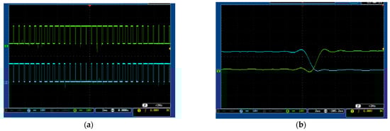 Moreover, and as can be seen in Figure 21a, the signals given to the gates of IGBTs 1 and 3 are in opposition to the signals delivered to the gates of IGBTs 2 and 4. Between the pulses delivered to the same branch of the inverter bridge, a dead time of 4 µs between the pulses has been maintained to prevent short circuits, as clearly seen in Figure 21b.
