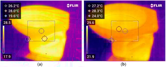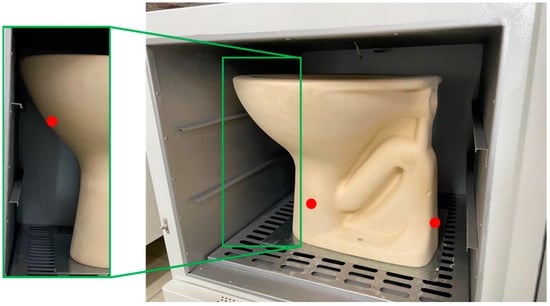 At pre-defined intervals, the sanitary toilet was removed from the oven to carry out measurements of the surface temperature, mass and main dimensions. The surface temperature of the sample at each instant of time was defined as the average calculated from measurements at three previously established points, using a digital infrared thermometer. Each of the three points were located on the front, the side and the back of the sanitary toilet, as shown in Figure 3.