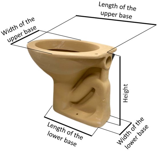 Since it is a complex geometry, it is very difficult to quantify the volumetric shrinkage of the sanitary toilets during the drying experiments. In contrast, five of the main dimensions of the sanitary toilet were measured during the drying experiments. The five measurements were height, length of the upper base, width of the upper base, length of the lower base and width of the lower base, as shown in Figure 4. The linear retraction of the sample at a given instant of time () was then defined as the average of these five measurements at that instant of time divided by the average of these five measurements at the beginning of the drying process ( s), as follows: