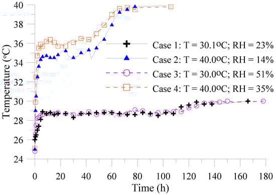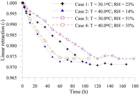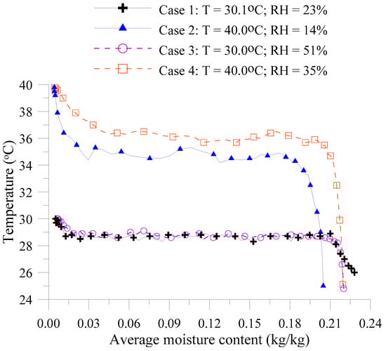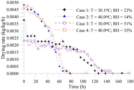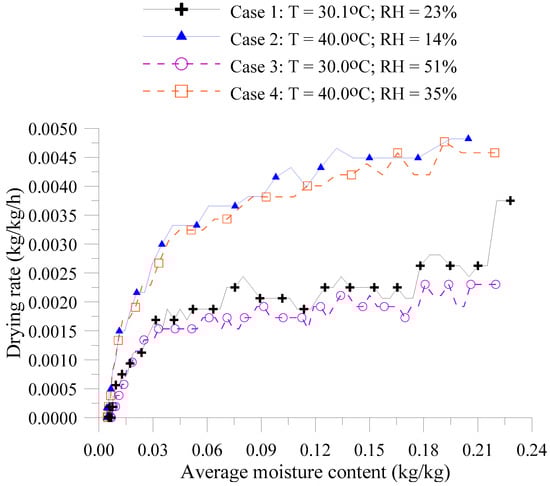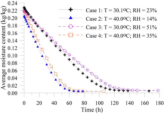 - The experiment carried out with the highest temperature and lowest relative humidity (Case 2: T = 40.0 °C; RH = 14%) presented the fastest drying rate among all the analyzed cases.