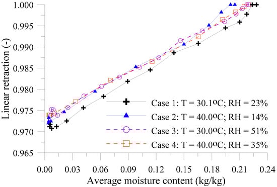 - There is a correlation between the linear retraction and moisture content of the sample; thus, the greater the moisture loss, the greater the sample shrinkage for each drying experiment.