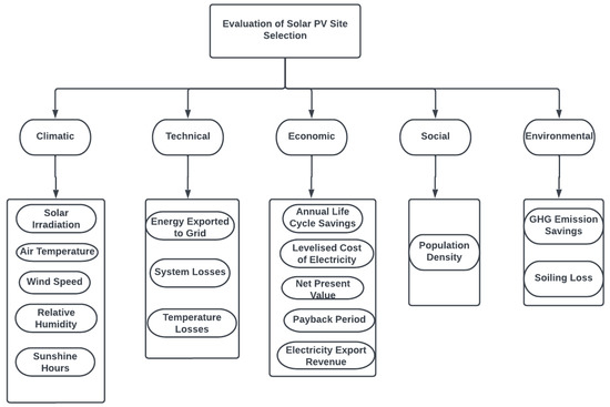 It is imperative to carefully assess and analyze several decision criteria when choosing a location for a solar PV power facility. This strategy guarantees the development of a highly effective and environmentally sustainable energy generation system. Based on the research carried out by [73,74,75], decision criteria and their associated sub-criteria were chosen in this study for the site selection of solar PV power projects. Five main criteria were established by the study: climatic; technical; economic; environmental; and social. A total of 16 sub-criteria were created by further evaluating each criterion based on numerous sub-criteria. Figure 2 gives a thorough summary of the chosen criterion and sub-criteria for the project’s location.