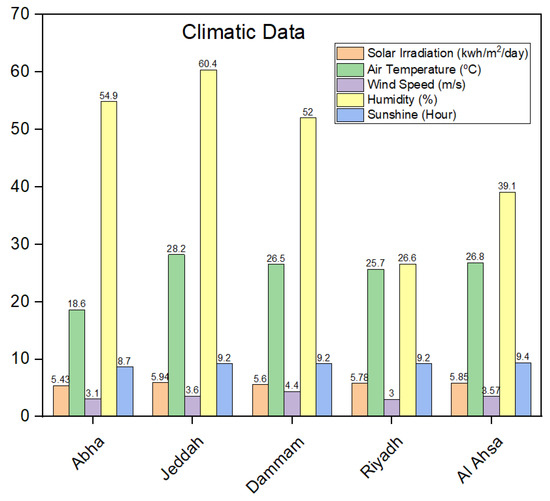 Saudi Arabia’s capital and largest city, Riyadh, is situated in the country’s central area. As a result of its strategic location and convenient access to neighboring Saudi Arabian provinces and cities, it serves as a major financial and transportation hub. Jeddah is the second-largest city in Saudi Arabia, which is located in the western part of the country, overlooking the Red Sea. Jeddah, a significant port city, acts as a crucial entry point for trade and commerce between Saudi Arabia and other nations. The third-largest city in Saudi Arabia, Dammam, sits in the country’s eastern area. It is a significant industrial and commercial hub noted for its oil industry and sizable seaport. Abha, which is located in southern Saudi Arabia, is a fairly small city when compared to the other chosen cities. It is a well-liked tourist attraction in the nation due to its scenic beauty and temperate environment. Lastly, Al Ahasa, well known for the agricultural sector, is a city in eastern Saudi Arabia. Numerous colleges and research centers are also located in the city. By selecting these particular cities, the study can offer a more thorough analysis of the potential benefits as well as challenges of putting solar PV power projects into practice in Saudi Arabia. Additionally, it can shed light on the best practices for project execution and highlight the obstacles to deployment that must be removed to enable the development of renewable energy in the country [84].