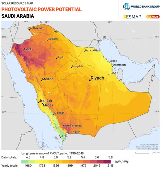The Kingdom of Saudi Arabia has traditionally relied heavily on oil as its primary source of energy. However, the nation is attempting to diversify its energy mix as worries about climate change and energy security increase. Because Saudi Arabia is situated in a region with abundant solar resources and receives high levels of solar radiation [9], solar energy has a significant potential to meet the country’s energy needs. As a result, the nation has recently made large investments in solar power research and is seeking to increase the proportion of solar power in its energy mix [10].