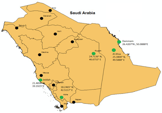 Most regions in Saudi Arabia receive sufficient solar irradiation throughout the year, which creates very good geographic conditions for solar system installation. The primary criterion used to select the cities for this study was that each site must receive a minimum of 5 kwh/m2/day of solar irradiation. Therefore, in this work, Dammam, Riyadh, Abha, Jeddah, and Al Ahsa were identified as the chosen cities of Saudi Arabia to study, as indicated in Figure 5. In addition, various other factors, such as their location, size, and economic importance, were also considered. The fact that the chosen cities are spread throughout different regions of Saudi Arabia enables a more thorough evaluation of the viability and potential of solar PV power projects throughout the entire country. Additionally, due to their immense scale and economic significance, they are appropriate for research on how solar PV power plants can have a significant impact on Saudi Arabia’s economy. A brief description of each of the five chosen cities can be found in the paragraph that follows.