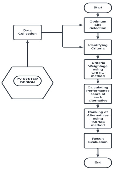By analyzing the selection criteria for solar photovoltaic (PV) sites and creating a decision-support system, our study significantly contributes to the field. It is worthwhile to note that no previous study has offered objective weights to the factors considered in selecting a solar PV location utilizing the objective CRITIC approach. Our main goal is to use the CRITIC–TOPSIS decision-making approach to evaluate the significance of factors impacting the site selection of solar PV projects in order to fill the research gap. The block diagram of the MCDM technique used in this study is shown in Figure 1.