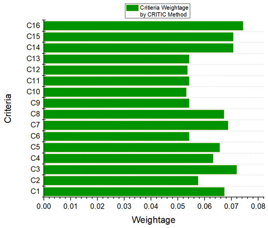 Conflicting criteria are frequently used in an MCDM scenario to distinguish between alternatives [40]. As a result, an alternative may not always be able to completely satisfy all set criteria [41]. To account for these contradicting relationships, the CRITIC approach uses the Pearson correlation coefficient, which has a range of −1 to 1. The two criteria, cj and cj’, are independent of one another when the coefficient is zero. When the coefficient is negative, the criteria are moving against one another. The contradiction between the two criteria gets worse as the co-efficient gets closer to 1. In contrast, a positive coefficient shows a parallel relationship between the two criteria and, when both have significant positive coefficient values, implies a disproportionate overlap. A criterion that has a high positive correlation with other criteria does not add new information and is, therefore, viewed as having less value overall. The CRITIC approach assures that a criterion with a larger degree of conflict or a lower degree of recurrence has a higher weight by adhering to this concept, which is based on specific formulas [42].