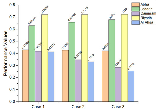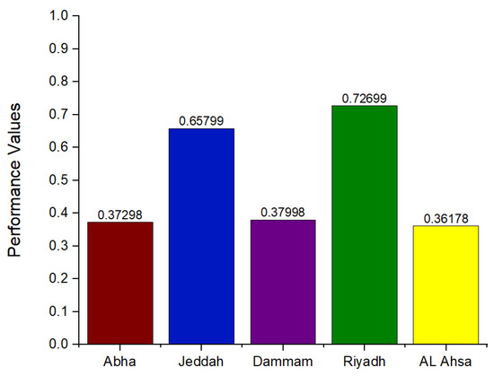 To the best of our current understanding, this research is the first effort to apply the CRITIC–TOPSIS techniques to Saudi Arabia for the purpose of assessing and prioritizing the site selection of solar PV generating plants. The chosen criteria were ranked according to their weights using the CRITIC methodology, while TOPSIS was used as a second method. Calculating the Euclidean distance allows TOPSIS to ascertain how close each alternative is to the ideal solution. The approach ranks alternatives according to how close they are to the preferred outcome and how far they are from the undesirable outcome [72]. Alternatives for the site selection of solar PV power projects in Saudi Arabia were categorized using the TOPSIS approach.