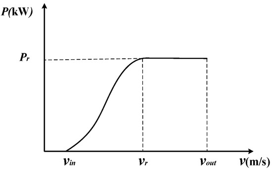 where, P(v) is the theoretical output of wind turbine, kW; is the rated power, kW; v is the real-time wind speed, m/s; , , and are the cut-in wind speed, rated wind speed, and cut-out wind speed, respectively, m/s; is the wind energy utilization coefficient; is the air density, kg/m3; A is the swept area by the wind wheel, m2.