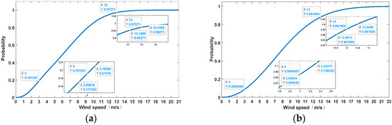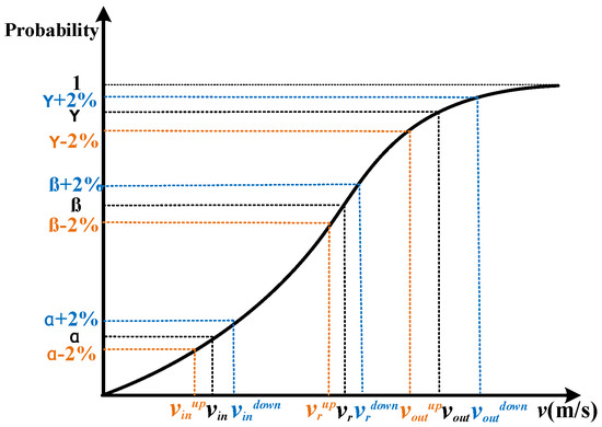 Maximum likelihood estimation is a commonly used method with high accuracy in Weibull fitting [44]. This paper performs Weibull fitting on the wind speed of the wind farm. According to the contents of the previous section, when wind speed shows an upward trend, on the cumulative distribution curve of wind speed, each partition node becomes the corresponding wind speed when the probability of the current cumulative distribution decreases by 2%, denoted as , , and , respectively; when the wind speed shows a downward trend, each partition node becomes the corresponding wind speed when the current cumulative distribution probability increases by 2%, denoted as , , and , respectively. The specific situation is shown in Figure 2: