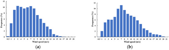 Wind speed frequency histogram. (a) Wind farm A. (b) Wind farm B.