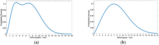 where, is the wind speed, m/s; is the given wind speed, m/s; is the shape parameter; is the scale parameter.