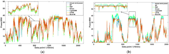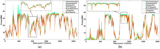Table 8 shows the forecasting results of the above models. Figure 16 shows the forecasting results of the two wind farms. Due to the use of spline interpolation for classification and screening in EMD, the shortcomings of separation and intermittency restricted the effectiveness of similar frequency components separation. Moreover, it was susceptible to noise interference, resulting in mode mixing and endpoint effects [51]. A large amount of wind power data inevitably contains noise, so EMD-BiLSTM performed the worst. At the same time, due to the excessive EMD components, the prediction time and calculation cost of the prediction model were greatly increased. We observed that BiLSTM (wind) had the best prediction performance among the six hybrid models. For wind farm A, compared with the BiLSTM model, the MAE, RMSE, and MAPE of BiLSTM (wind) were reduced by 0.5544 MW, 1.6256 MW, and 22.543%, respectively; when compared with BiLSTM (speed), the MAE, RMSE, and MAPE of BiLSTM (wind) were reduced by 0.4008 MW, 1.1404 MW, and 11.2261%, respectively; and when compared with BiLSTM (direction), the MAE, RMSE, and MAPE of BiLSTM (wind) were reduced by 0.0882 MW, 0.2903 MW, and 4.7308%, respectively. For wind farm B, compared with the BiLSTM model, the MAE, RMSE, and MAPE of BiLSTM (wind) were reduced by 0.7749 MW, 1.0830 MW, and 13.642%, respectively; when compared with BiLSTM (speed), the MAE, RMSE, and MAPE of BiLSTM (wind) were reduced by 0.4562 MW, 0.6644 MW, and 12.4738%, respectively; and when compared with BiLSTM (direction), the MAE, RMSE, and MAPE of BiLSTM (wind) were reduced by 0.0294 MW, 0.4316 MW, and 4.5341%, respectively. From the above analysis, we know that the MAE, RMSE, and MAPE of BiLSTM (wind) are lower than that of all forecasting methods in the previous round, and the accuracy of the methods proposed in this round has been greatly improved. The prediction curve had a high fitting degree with the actual power curve. The prediction effect of BiLSTM (wind) was better than that of Wavelet-BiLSTM and EMD-BiLSTM, which verifies the effectiveness of the similarity data extraction method proposed in this paper. At the same time, it was also better than that of BiLSTM (speed) and BiLSTM (direction), which were better than BiLSTM, indicating that both wind speed division and wind direction clustering play a positive role in improving the prediction accuracy, and the hybrid forecasting model of both of them strengthens this positive effect.