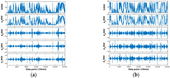 The wavelet decomposition results. (a) Wind farm A. (b) Wind farm B.