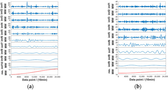 The EMD decomposition results. (a) Wind farm A. (b) Wind farm B.