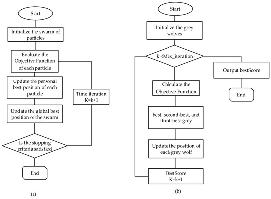 Flowchart for (a) basic PSO algorithm and (b) GWO algorithm.