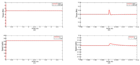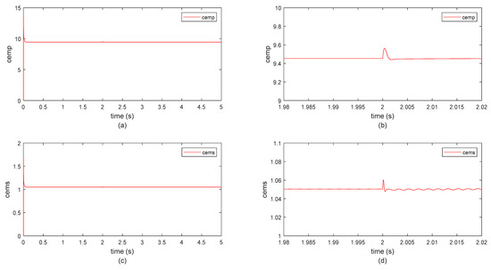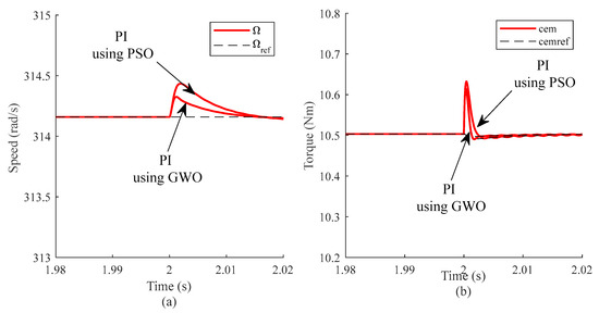 Figure 7a–d show the electromagnetics torques’ components (cemp and cems) with the optimization of PI controller parameters using the GWO algorithm while subjecting the stator’s resistance to a step changed from its nominal value to one-quarter of the nominal value (the speed reference is maintained at a constant level). The electromagnetic torque components for a five-phase machine can be expressed in the P–S reference frame. The total electromagnetic torque is the sum of the two torque components.
