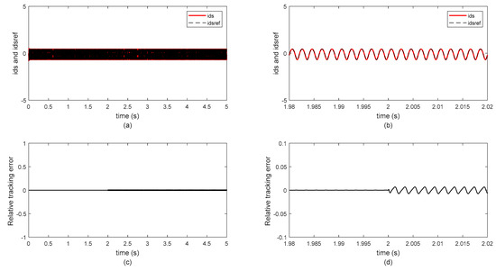 In Figure 4a–d shows the currant (iqs) and relatives’ tracking errors in the presence of stator faults in the optimization of the PI controller parameters using the GWO algorithm. The stator currants (iqs) are shown in Figure 4a with the starting transients of the stator fault as it develops the relatives’ tracking error, as displayed in Figure 4d. When the relatives’ tracking error is in steady state, the stator resistance is changed from Rs to Rs/4 to show the currant harmonics.