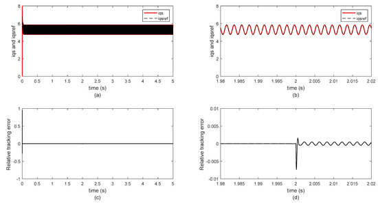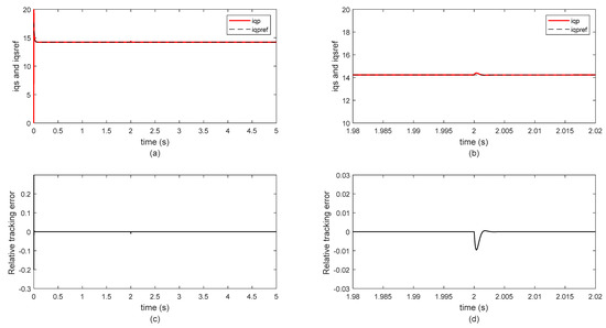Figure 5 and Figure 6 show the currant iqs component and currant iqp component in the presence of stator faults with the optimization of PI controller parameters using the GWO algorithm, respectively. The currants (iqs) are shown in Figure 4a with the starting transients of the stator fault as it develops the relatives’ tracking error, as displayed in Figure 5d. When the relatives’ tracking error is in steady state, the stator resistance is changed to show the currant harmonics. This is also true for iqp.