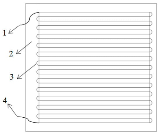 A Keithley 2700 multichannel data acquisition system with true six-and-a-half-bit (22-bit) accuracy from Keithley is used, and the wall temperature test pad shown in Figure 2 is composed of a serpentine copper wire and a based cloth, which is based on the relationship between the wire resistance I and its temperature T as shown in Equation (1) [], where I0 is the wire resistance at 273 K and ξ is the wire temperature coefficient of resistance, which is 0.004286.