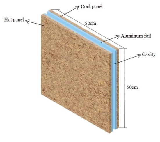 The narrow cavities tested in this paper include vertical cavities with thicknesses of 5 mm, 10 mm and 15 mm and horizontal cavities with thicknesses of 10 mm, 15 mm and 20 mm. The cavities are made of 5 mm thick wood, and their radiation characteristics are changed by configuring the inner walls without aluminum foil, with single-sided aluminum foil, and with double-sided aluminum foil. Figure 3 shows the cavity geometry with double-sided aluminum foil. Table 2 shows the information of the cavity and its materials.