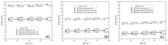 Figure 5 shows r in the horizontal cavities with 10 mm, 15 mm and 20 mm thicknesses and their corresponding equivalent heat transfer coefficient K with q. The change trends and their reasons in the horizontal cavities are similar to that of vertical cavities, but the test data in both cavities are different. The average values  (W/(m2·K)) and  (%) are 11.45/71.95, 9.17/75.39 and 8.32/73.57 in CWOA with 10 mm, 15 mm and 20 mm thickness, respectively; 4.95/8.88, 4.72/9.44 and 3.93/9.43 in CWSA and 4.76/7.92, 4.42/4.6 and 3.85/4.56 in CWDA.