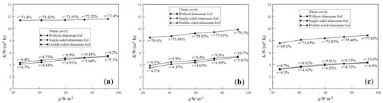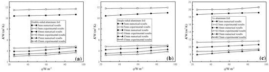 Before the aluminum foil is pasted, r is also dominant, with a maximum of 79.1% in CWOA with 15 mm thickness at 91.84 W/m2, and a minimum of 69.1% in the CWOA with 20 mm thickness at 25.2 W/m2 due to improved convection. After the aluminum foil is pasted, the sharp decrease of K and r also occurred. Compared with CWOA of the same thickness at the tested heat flux density range, the average value  and  values in CWSA with 10 mm, 15 mm and 20 mm thickness are reduced by approximately 57%/88%, 49%/88% and 53%/87%, respectively. The aluminum foil effect in CWDA is also slightly larger than in CWSA, with the average values of  and  in CWDA with 10 mm, 15 mm and 20 mm thickness enlarged by approximately 4%/11%, 6%/51% and 2%/52%, respectively.