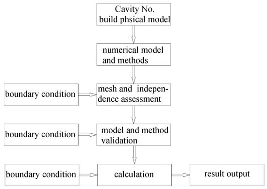 In practice, the inclined cavities with various angles could be more common in a vehicle/train envelope. To comprehensively reveal the aluminum foil effect on the heat transfer of the narrow cavity at various angles, the analysis of the heat transfer characteristics in the cavity with different thicknesses, inclination angles and system emissivity were carried out based on the previous experimental research results and the FLUENT software. Based on the finite volume method, FLUENT software has many mature models and advanced numerical methods, and its unstructured and adaptive mesh technique is also very effective, so the heat transfer problem can be quickly and accurately calculated. Figure 6 is the flow chart of the numerical calculation.