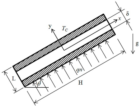 where σ is the radiation constant, 5.67 × 10−8 W/(m2·K4); Thm and Tlm are the temperatures of the cold and hot surfaces, respectively, K; and εs is the system emissivity of the narrow cavity shown as Equation (5), of which ε1 and ε2 are both parallel surface inner emissivities.