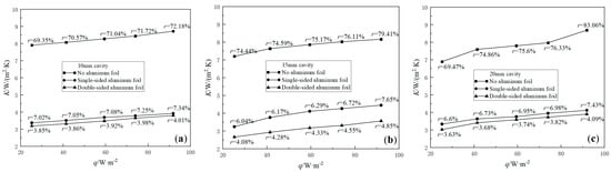 Before the aluminum foil is pasted, r is dominant, with a maximum of 78.31% in CWOA with 15 mm thickness at 91.84 W/m2, and a minimum of 55.6% in CWOA with 5 mm thickness at 25.2 W/m2. After the aluminum foil is pasted, the sharp decrease of K and r indicates that the heat radiation effect on the heat transfer in the usual narrow cavities is dominant, and that it can be effectively suppressed by pasting the surface with low emissivity materials. Compared with CWOA of the same thickness at the tested heat flux density range, the average values of  and  in CWSA with 5 mm, 10 mm and 15 mm thickness are reduced by approximately 41%/91%, 57%/87% and 62%/85%, respectively. The aluminum foil effect in CWDA is slightly larger than in CWSA; the average values of  and  in CWDA with 5 mm, 10 mm and 15 mm thickness are enlarged by approximately 2%/47%, 5%/47% and 4%/47%, respectively.