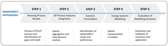 With the aims of proposing, developing, and applying an integrative methodology that allows stakeholders from different domains to participate in the energy modeling process, this study adopts and expands the participatory methodology developed and presented by Yu et al. [30]. As shown in Figure 1, this methodology consists of five steps, covering the whole process of spatially explicit energy systems modeling (heating systems in this study) and based on stakeholder participation.