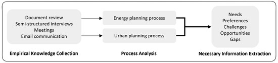 First, the energy and urban planning processes are analyzed to identify the needs, challenges, and preferences from both the energy and urban planning perspectives. After reviewing the official publications of the municipal plans, an empirical research approach, e.g., semi-structured interviews with stakeholders, is adopted for Step 1. Once the documents are reviewed, a questionnaire that forms the basis for the stakeholder interviews is formulated. The questions concern: