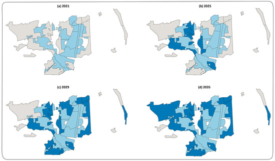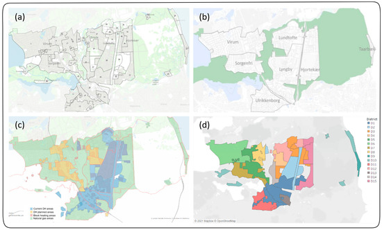 The municipality stakeholders expressed the need to define new districts for heat planning. This is because the establishment of new districts enables the municipal planners to identify and prioritize areas for DH expansion using a detailed feasibility analysis. Therefore, the new districts should be determined based on the relevant spatial information. In the case of LTK, three maps containing different items of information from urban and heat planning documents are combined to draw up the new districts (see Figure 4). First, the existing geographic divisions of the municipality in the national building and dwelling registry (BBR) serve as the basic framework. In Denmark, for each individual building and residential or business unit, its identification, location, purpose, year of construction, technical conditions, and power/heating installation are registered in The Central Register of Buildings and Dwellings (BBR). Although the BBR is maintained by the Ministry of Housing, Urban and Rural Affairs, it is the property owners’ responsibility to provide input data and to ensure that the BBR information for their property is accurate. Such information is used for various purposes by state and municipal officials, as well as by private companies. The municipality’s official urban quarter divisions and current heating supply structure are used to define the new districts. Updated information on the DH and natural gas grid infrastructure can be found in PlansystemDK “https://kort.plandata.dk/spatialmap (accessed on 9 April 2023)”, which is a public database used by all Danish municipalities. With this combination of sources, the communication with the municipal planners continuously feeds their preferences into the process. As a result, 15 new districts are identified, as shown in Figure 4d. The maps are overlaid in QGIS Desktop 3.18.2, and the coupled BBR data in Figure 4a is provided with the necessary information, e.g., floor area, building numbers, building type, construction year, for the following section to be fed into the modeling tool as input data.