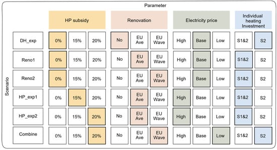 In any scenario, the climate goals of achieving 25% CO2 reduction compared to the level in 2018 by the year 2025 and net-zero emissions by the year 2050 should be met, and natural gas- and oil-fired heating should be phased out by the year 2035. While attempting to reach these goals, four parameters (heat pump subsidy, renovation, electricity price, and individual heating investment) have been selected as the deterministic parameters for the scenarios. The selection reflects the stakeholders’ input and some of the important points, including the following: “…in general, we will work on renovation scenario because people are looking at more house renovations because of high energy prices on both electricity and natural gas” [55]. “Individual heating scenario is very likely. But focus will be stage 1. There will be some HP remained but will mostly be district heating. Some of the very relevant areas would be one in the top left (District 6), they get the DH at the latest so it is very relevant to look at other possibilities” [53].