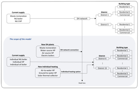 This section presents how the heating systems model is built based on the municipal stakeholders’ participation and describes the assumptions that are made. The heat demand of each district is exogenously given. Only areas that are currently being supplied with natural gas, i.e., Districts 6–15, are modeled. The remainder of the municipality, which is already connected to the existing DH network, i.e., Districts 1–5, is assumed to continue using the current heat supply option in the future. Two levels of heat supply technologies are given: individual heating and communal heating technologies, i.e., DH. The former includes small HPs, gas boilers, and solar collectors supplying heat to individual dwellings (Appendix A), while the latter includes large-scale HPs, electric boilers, and waste incineration units supplying heat to the heat networks (Appendix B). In other words, the DH customers receive their heat through the heat network, which is in turn connected to the plants supplying the DH. Prices for different fuels are exogenously given to the model (Appendix C). Figure 6 shows the structure of the developed model.