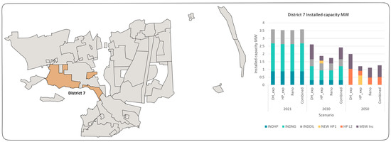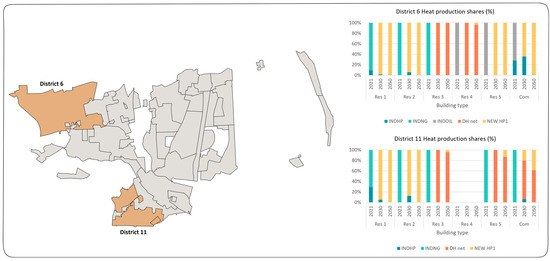 The process of applying the developed modeling methodology to the municipality has generated numerous graphs presenting various long-term heating pathways, not only at the municipality level, but also at the district and building levels. Since the focus is on the assessment of the benefits of the methodology for urban heat planning, the selected modeling results exemplifying how the applied methodology can contribute to heat planning are presented. The selected results include spatial overviews of the DH network expansion, heat production by building type in the districts, and future installed capacities of different scenarios in the districts. The presented examples have been selected based on the following criteria: (1) the addition of a new layer of information to those generated in previous energy systems modeling studies and (2) the provision of what the municipality stakeholders seek to learn from the model. Figure 7 shows an overview of how the annual heat production mix changes over time in each scenario. Together with the heat capacity mix, CO2 emissions, and total system cost, these are the general outputs of ESOMs.