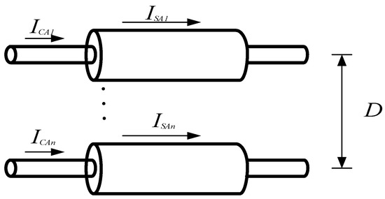 Schematic diagram of current distribution for cables connected in parallel. Note: is the core current of sub-cable n of phase A, is the metal sheath current of sub-cables n of phase A, is the distance between the geometric center of two cables.