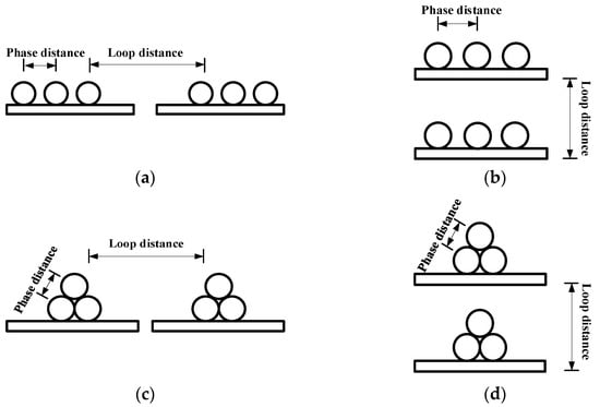 Phase spacing is the spacing between the geometric center of adjacent cables in a single loop. When double-loop cables are in a flat arrangement, the loop spacing is the spacing between the geometric center of the closest cables in a double loop, as shown in Figure 3a,c. When double-loop cables are in a vertical arrangement, the loop spacing is the spacing between the brackets, as shown in Figure 3b,d.