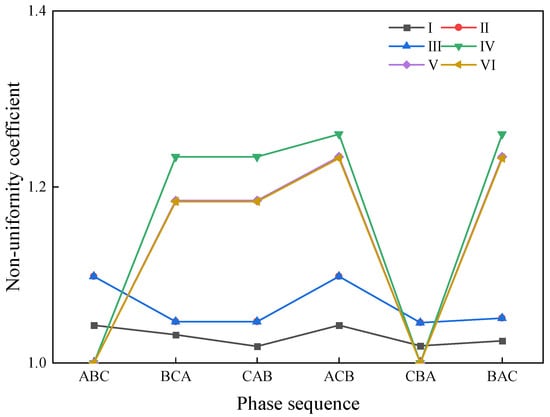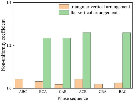 The non-uniformity coefficient of cable core current is depicted in Figure 6. In the case of triangular vertical arrangement, the current is almost uniformly distributed between the six conductors. The maximum non-uniformity coefficient is only 1.0426 for abc and acb, and the minimum non-uniformity coefficient is 1.0186 for cab. In terms of flat vertical arrangement, the non-uniformity coefficient varies greatly. If the phase sequence of the second loop is acb or bac, both the non-uniformity coefficients are 1.2534. When the space between three-phase cables is very small, the electromagnetic coupling between the two loops connected in parallel is relatively small, and hence the mutual impedance is enhanced. However, the phase sequence has a greater impact on the current distribution under the flat vertical arrangement. From Equations (2)–(5), it can be seen that, if the mutual impedance of sub-cables of each phase with other cables is equal, the cable core current will be ideally symmetrical.